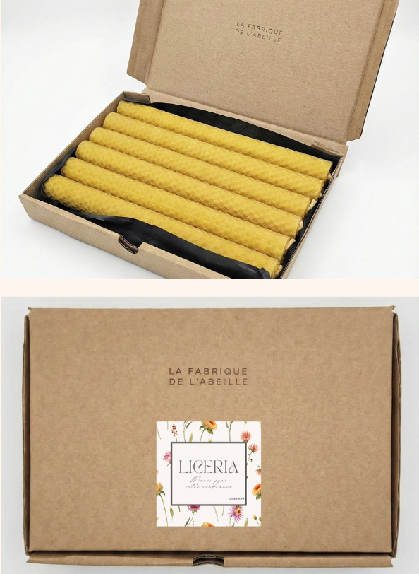 Un coffret de 6 chandelles traditionnelles roulées à la main, qui met en lumière un savoir-faire artisanal unique dans un coffret personnalisé à vos couleurs.