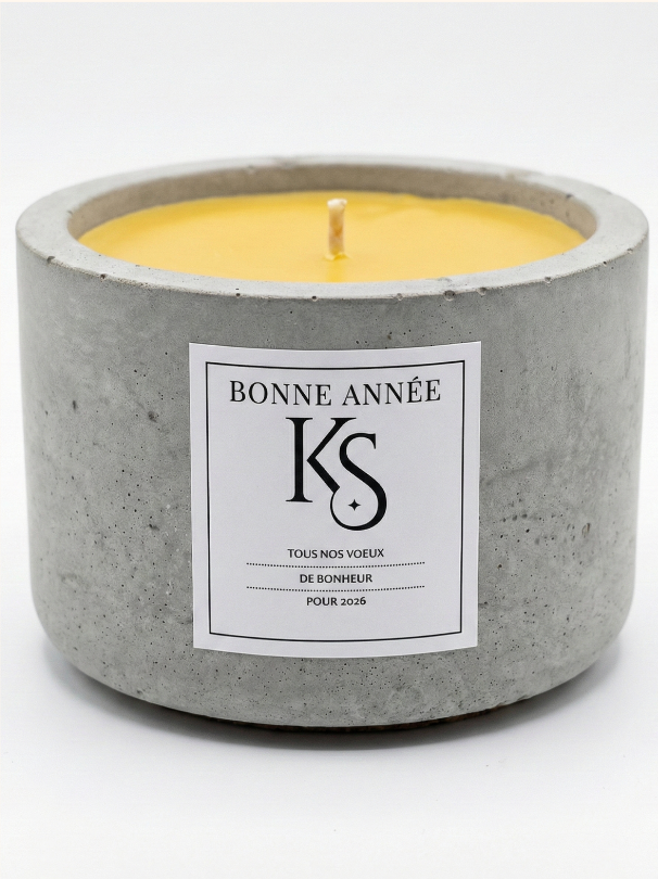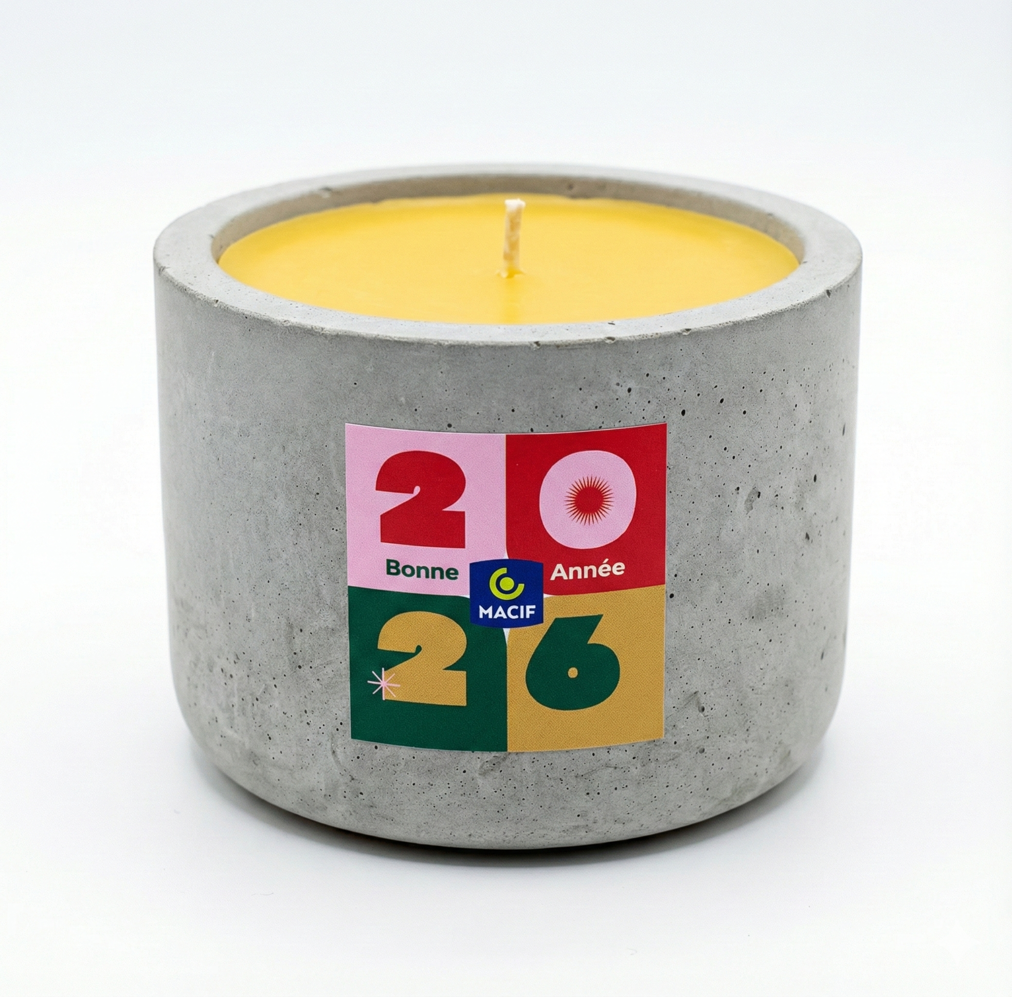 Une bougie coulée à la main dans un pot en béton moderne, personnalisable à votre image, qui restera dans la décoration de vos clients ou collaborateurs.