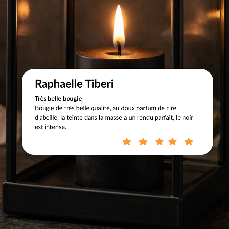 Bougie de très belle qualité, au doux parfum de cire d'abeille, la teinte dans la masse a un rendu parfait, le noir est intense.
